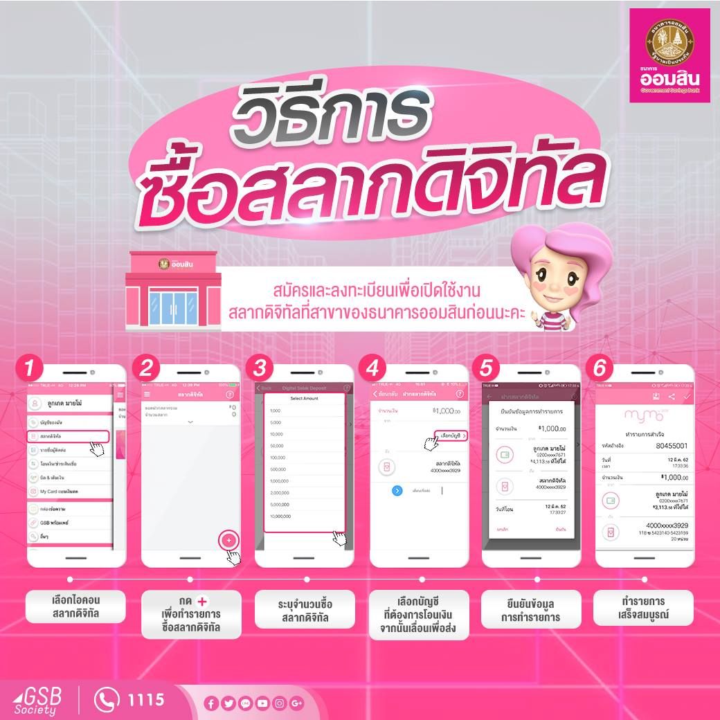 เมอเปดใชงานใน 3 ขนตอน เรยบรอยแลว เรมตนขนตอนการฝากสลออมสนดจทล 1 ป ซงสำหรบรางวลพเศษ 1 ลานบาท 20 รางวล. การจะลงทนสลากออมสนใหคมนนตองซอสลากในจำนวนทมากพอเพอใหถกทกงวด ตวอยางเชน ถาลงทนดวยเงนทกๆ 5 แสนบาท.